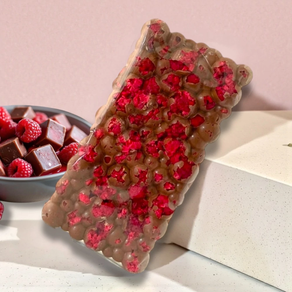 Az első falatnál a selymes tejcsokoládé olvad el a szádban, majd megérkezik a málna friss, gyümölcsös karaktere, ami könnyeddé és különlegessé teszi az élményt.